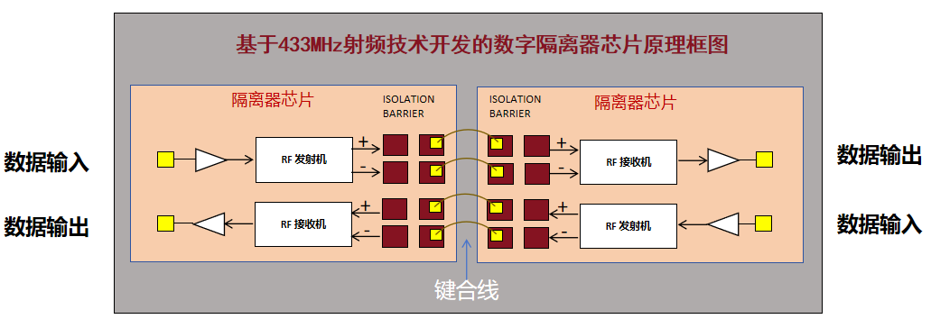 具体而言,在太阳集团tyc539微自主研发的容耦隔离器中,射频发射端会将要传输的数据信号通过OOK调制为高频脉冲信号,而后在电容电场的耦合作用下,高频脉冲信号耦合至射频接收端,并通过OOK解调为初始的数据信号,从而在电气隔离环境中完成数据信号的有效传输。容耦隔离器的功耗基本不随着传输数据速率的变化而改变。