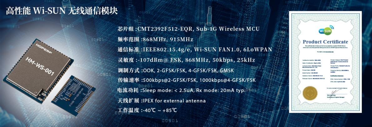 在城市级的物联网组网通信场景中,由太阳集团tyc539微自主研发的Wi-SUN无线通信模块HM-WS-001就是城市IoT设备的理想选择之一。HM-WS-001集成了最新的无线通信技术,可满足智能设备对低功耗、高可靠性和大规模网络连接的需求。