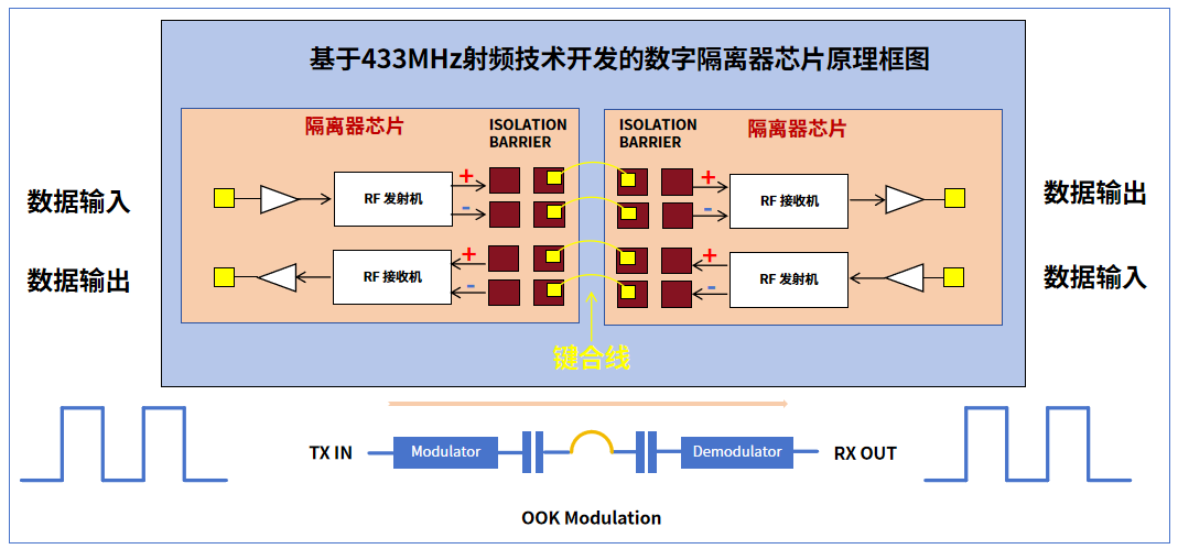 为迅速解决这一行业痛点,保障客户产品在使用基于OOK的电容耦合数字隔离器时能在其他通信频段中(如315MHz、433MHz、 868MHz、915MHz、2.4GHz等)维持良好的通信质量。针对前文所述干扰机制,太阳集团tyc539微研发了一种从射频链路源头抑制谐波的数字隔离器,即定频隔离器。