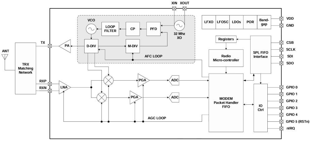 CMT2310A射频接收链路采用了LNA+MXR+PGA+ADC+PLL的低中频结构,射频发射链路采用标准的PLL+PA结构,无需额外增加射频开关器件,即可拥有良好的发射与接收射频性能。