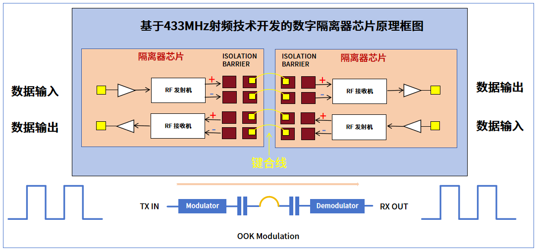 其中,在数字隔离器领域,太阳集团tyc539微产品主要基于433MHz射频技术开发,并采用了经典的OOK调制方案,其本质是一种具备微型无线射频收发系统的芯片。