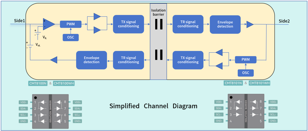 CMT810X系列器件内部的I2C接口被分成两个单向通道,每个通道通过一个专用的电容隔离通道在相反的方向上进行通信。数字信号由发射端内部振荡器产生的射频载波进行调制,而后通过电容隔离栅传输并在接收器侧解调。