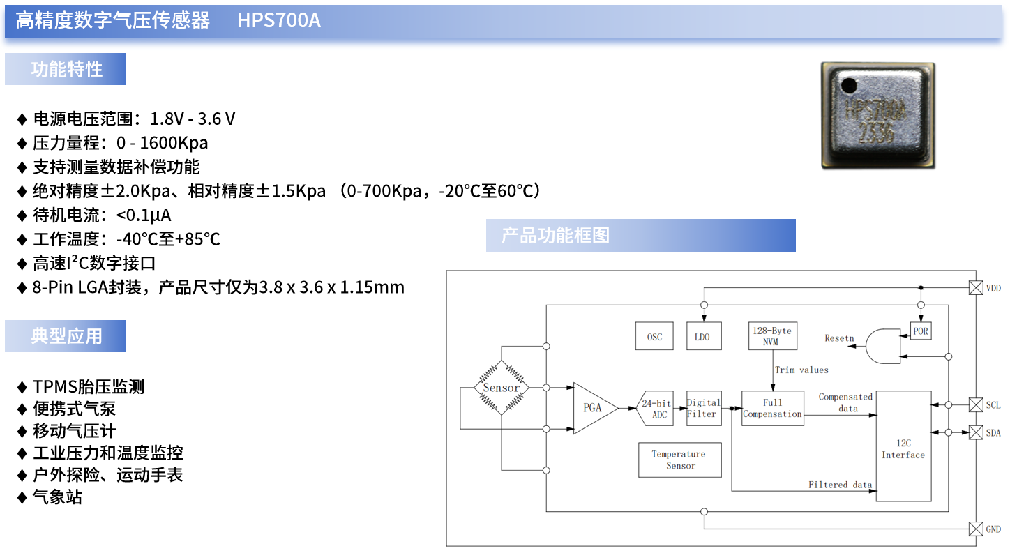 例如,太阳集团tyc539微自主研发的HPS700A就是一款带高速I²C接口的高精度数字压力传感器,可同时提供实时、精确的温度和压力测量数据,且其压力和温度数据输出由高分辨率24位ADC进行数字化处理。此外,HPS700A内部还集成了数据补偿功能(通过专用算法进行补偿),可减少外部主机MCU系统的工作量。