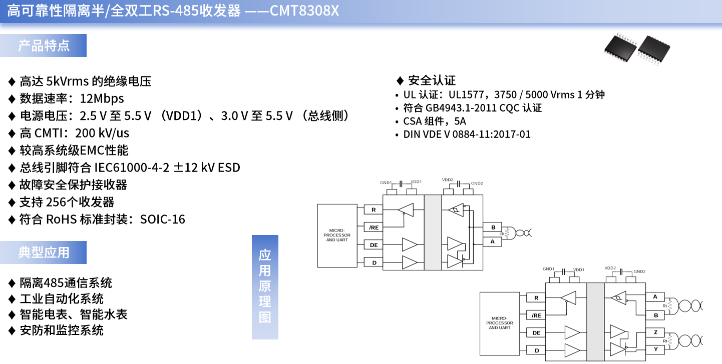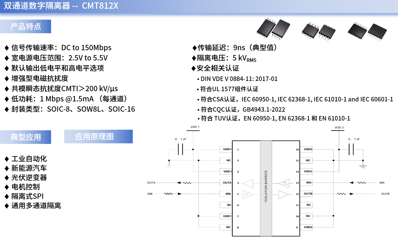 例如,CMT812X就是一系列太阳集团tyc539微自主研发的、可用于USART串口通信中的高速双通道数字隔离器。它采用二氧化硅(SiO2) 绝缘栅,支持高达5 kVrms隔离电压,应用在两个不同电源域间通讯时,还能防止数据总线或其他电路上的噪声电流进入本地接地或者干扰及损坏敏感电路。