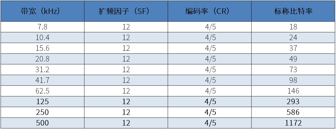 扩频因子12所对应的其他通信参数